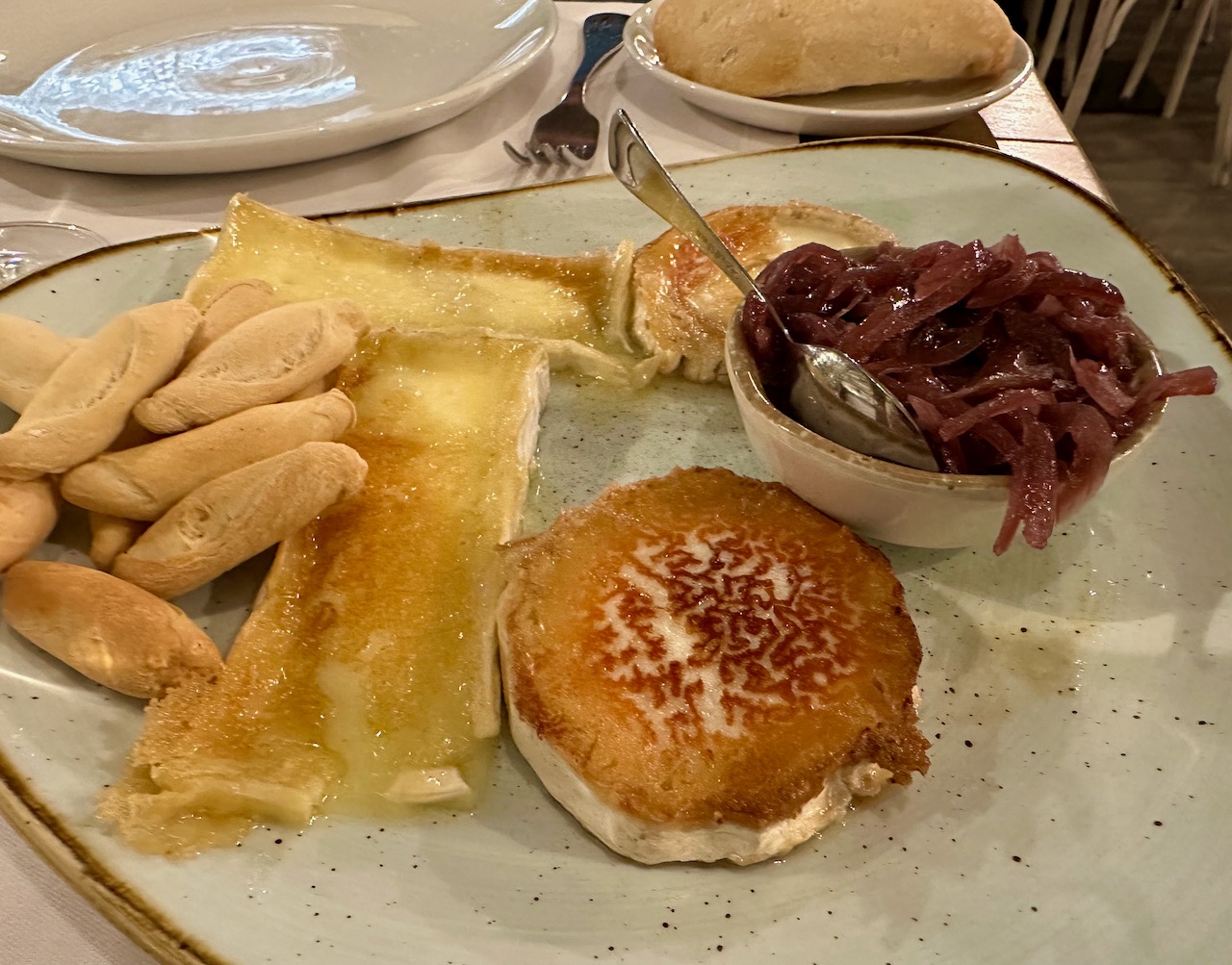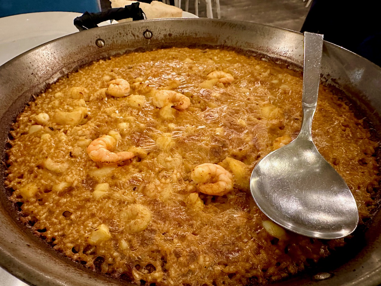 Sebastian had recommended this restaurant as one of his favorite spots for paella, so we ordered a shrimp paella. While waiting for our meal, we started with an appetizer of fried goat and brie cheeses with caramelized onion. Yum! I am not a paella expert …