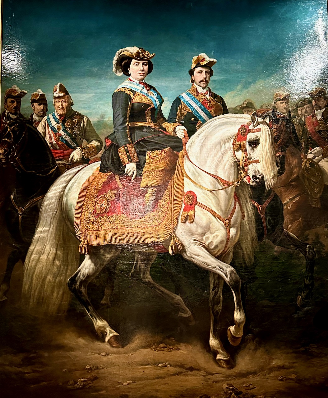 The painting viewable through the curtains is the Equestrian Portrait of Juan Prim (1844), a Spanish general and statesman, who was briefly Prime Minister of Spain until he was assassinated.