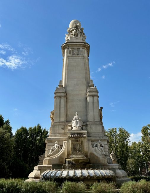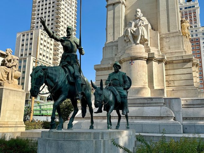 I knew we were near the Plaza de España, and I had wanted to see one monument there, so it was time to wander over to where the Gran Via ends (or I guess begins if you start from here) and check out Monumento Cervantes. First we saw the backside of the statue with a woman who “symbolizes literature.”