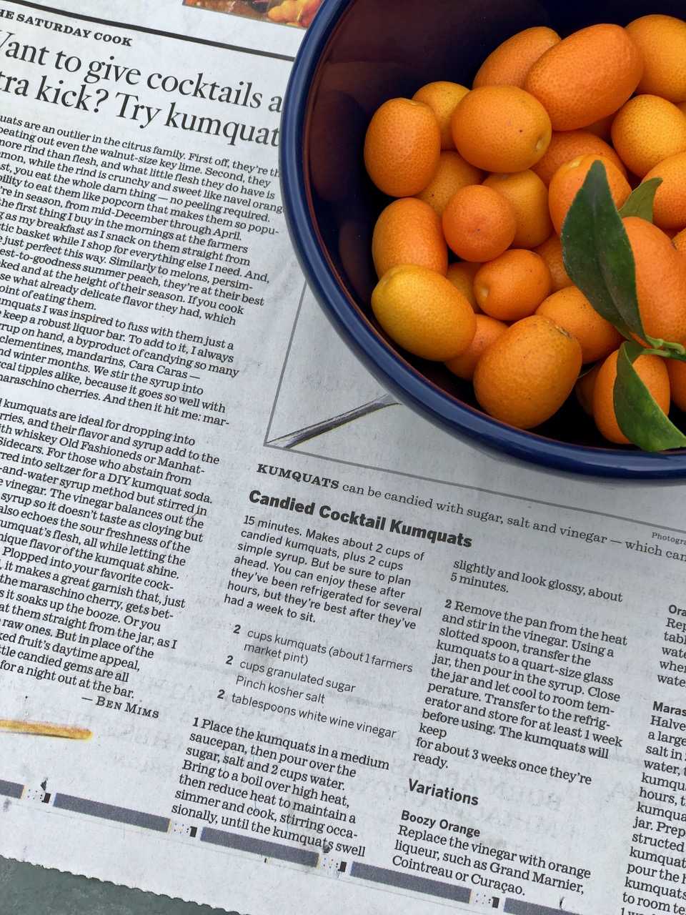 Recipe for Ben Mims’ Boozy Candied Cocktail Kumquats in the LA Times.