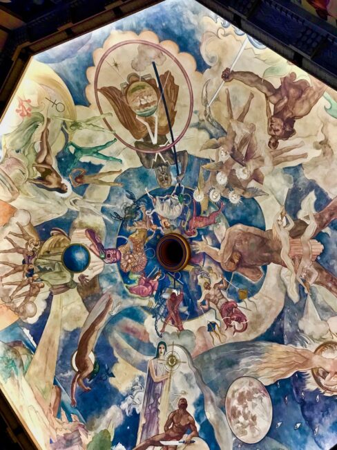 After looking down at the pendulum, raise your eyes to the colorful Ballin Ceiling Mural. In the 1930s, painter Hugo Ballin illustrated ancient stories of the sky. This ceiling tells stories of Atlas, Zeus, Mercury and even a woman holding the Star of Bethlehem.
