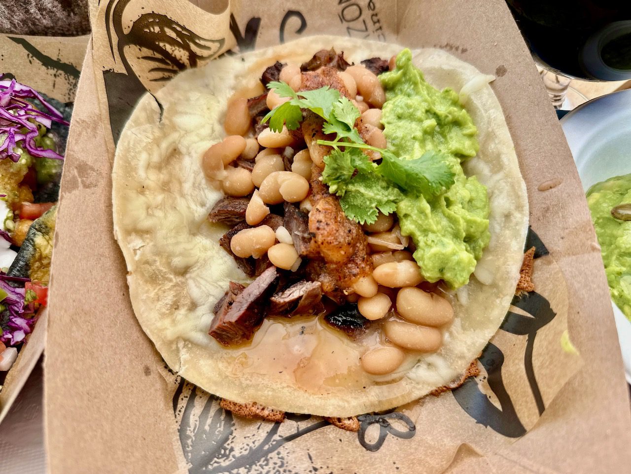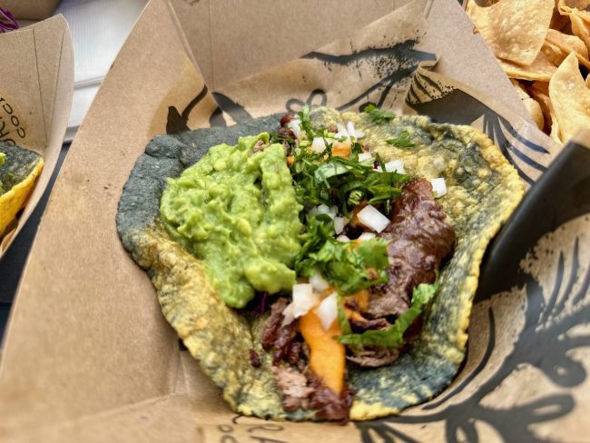 We started with a large side of guacamole, avocados, serrano chile, cilantro, onions, toasted market pepitas, and homemade chips which was delicious, but the smaller size would have been sufficient for the two of us. We each ordered two tacos expecting them to be small, but they were good sized and filling. Tracy ordered the Ensenada, crispy beer battered ling cod, cabbage, salsa cruda, pico de gallo, lime-mayo crema with a house-made corn tortilla. I ordered the Norteno, grilled skirt steak, cheese, guacamole, beans, salsa mugrosa on a house-made flour tortilla. We both ordered the New York sirloin steak taco with guacamole. All the dishes coming out looked great.