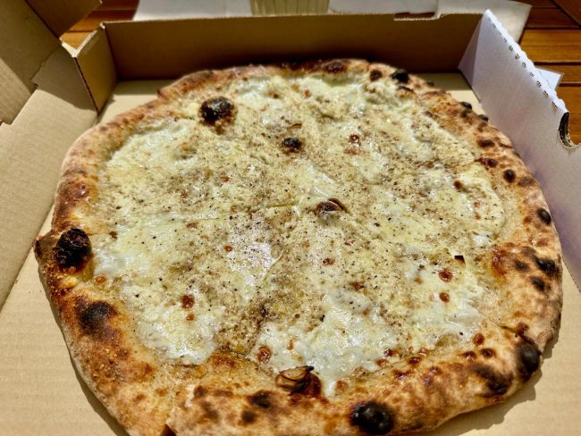 Our to-go pizza was the Cacio e Pepe Pie, mozzarella, Gioia ricotta, garlic, pecorino sardo, Burlap & Barrel black pepper. Tasted just like cacio e pepe without the pasta! I liked this pizza, but did add some prosciutto when we got home to offset the richness of the sauce.