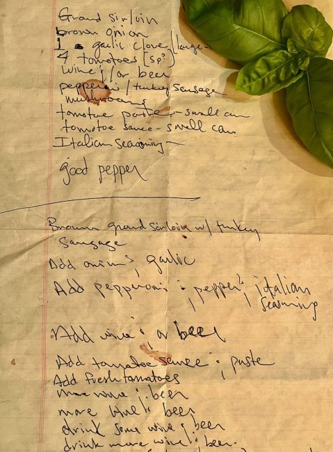 I have cleaned up Mark’s ingredient list and instructions over the years. The original recipe instructed, “Add whatever seasonings you have (except vanilla, cloves, cinnamon or pie spices).” I have interpreted that to be Italian Herb seasonings, crushed red pepper flakes, Kosher salt, fresh ground black pepper and bay leaves.
