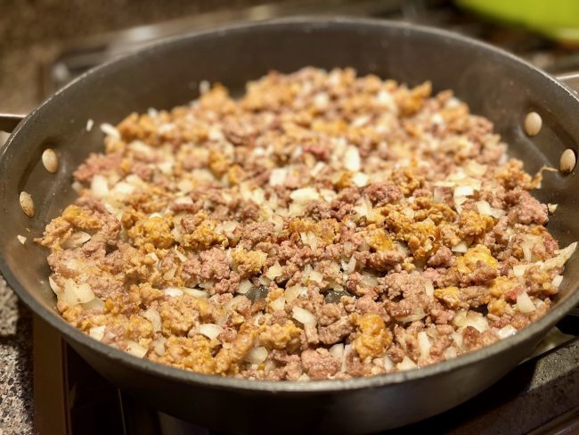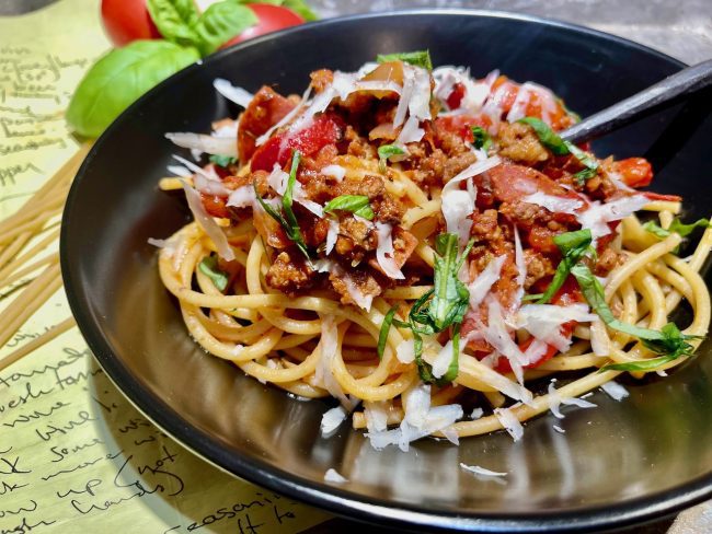 The sauce is a delicious blend of fresh tomatoes, ground beef and Italian sausage as well as beer and the secret ingredient of pepperoni slices, which puts it over the top in my book. Use the pepperoni slices you would use for a pizza. I tried it with uncured pepperoni but it just didn’t have that bold, rich, spicy, porky flavor. I like Hormel Original Pepperoni slices which are most likely full of things you don’t want to know, but, what the heck, it’s not like we eat it every day.