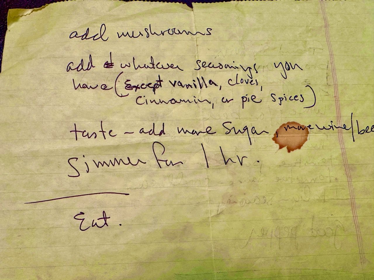 I have cleaned up Mark’s ingredient list and instructions over the years. The original recipe instructed, “Add whatever seasonings you have (except vanilla, cloves, cinnamon or pie spices).” I have interpreted that to be Italian Herb seasonings, crushed red pepper flakes, Kosher salt, fresh ground black pepper and bay leaves.