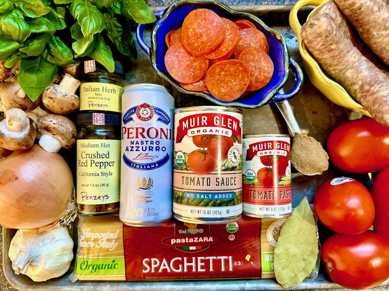 The sauce is a delicious blend of fresh tomatoes, ground beef and Italian sausage as well as beer and the secret ingredient of pepperoni slices, which puts it over the top in my book. Use the pepperoni slices you would use for a pizza. I tried it with uncured pepperoni but it just didn’t have that bold, rich, spicy, porky flavor. I like Hormel Original Pepperoni slices which are most likely full of things you don’t want to know, but, what the heck, it’s not like we eat it every day.