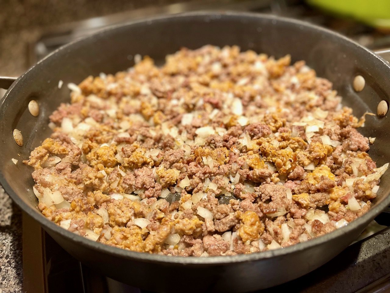 In a large sauté pan or Dutch oven heat the olive oil over medium heat. Add the ground beef and Italian sausage, and sauté until just browned and no longer pink, breaking up the chunks as it cooks (10 to 12 minutes). Drain if necessary. Add the onions and garlic and continue to sauté until just softened, about 5 minutes.