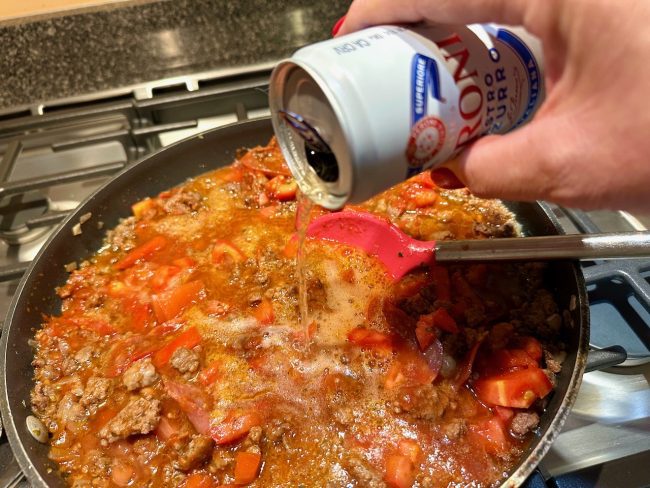 Stir in the Italian seasonings, brown sugar, red pepper flakes (if using), 2 teaspoons salt, pepperoni slices, diced tomatoes, tomato sauce, tomato paste and one cup beer.
