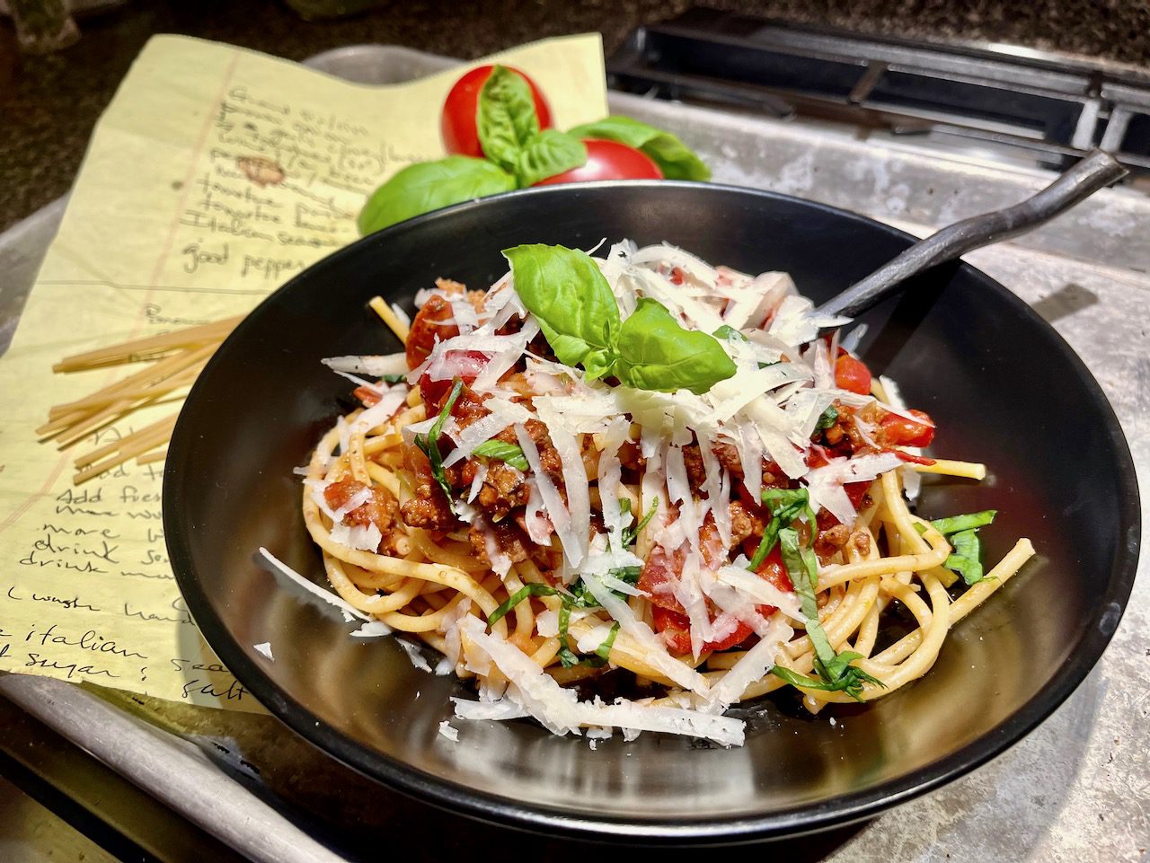 This spaghetti sauce recipe is from a former co-worker who wrote it down for me on a yellow legal pad with barely any guidance as to the amount of ingredients or really any particular cooking instructions, but it is our favorite spaghetti sauce.