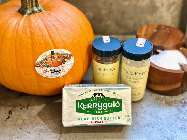 Drizzle the pumpkin with melted butter and sprinkle with cumin, salt and white pepper. Roast on a baking sheet until fork tender (45 to 60 minutes). Allow to cool. Scoop the pumpkin flesh out of the shell. Purée in a blender or small bowl with an emulsifier, adding a splash of water or broth if necessary to thin. This should make about 3 cups, reserve any extra for another dish.