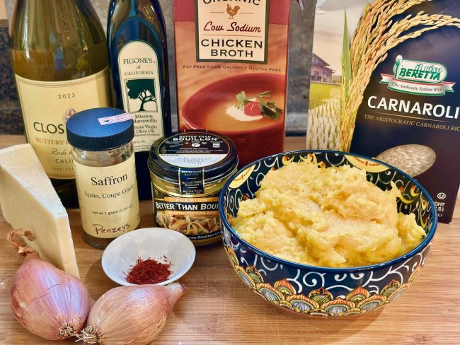 The pumpkin purée is better if you make it a day ahead of time to allow the flavors to meld. Cover and refrigerate. Bring to room temperature before making risotto.