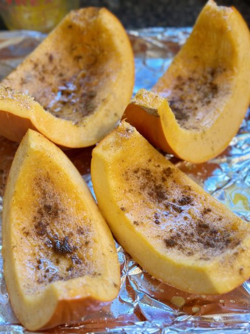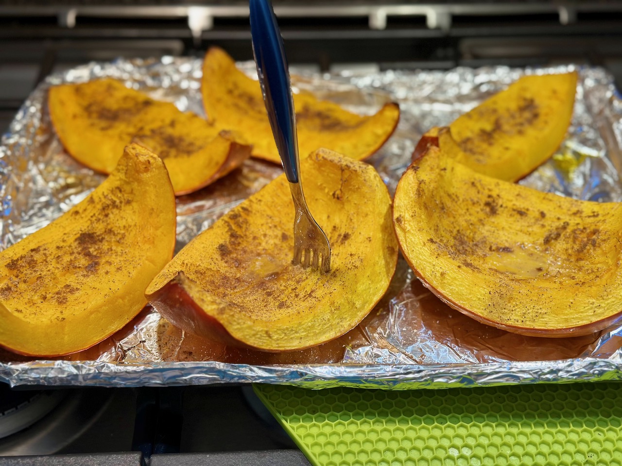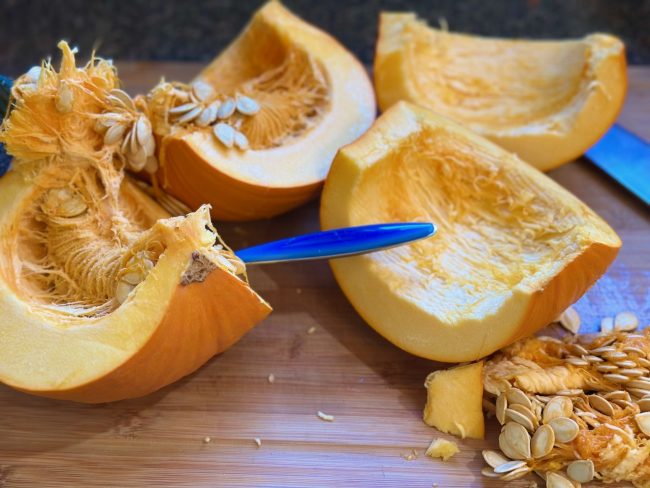 Preheat oven to 375F. Line a rimmed baking sheet with foil for easy cleaning. Cut the pumpkin into wedges and scoop out the seeds and stringy stuff.