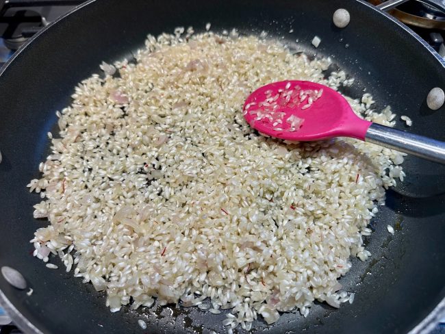 In a large sauté pan, heat the olive oil over medium heat. Add the shallots and cook stirring occasionally until translucent, about 3 minutes. Add the rice and the remaining saffron, stirring to coat the rice with the olive oil, and sauté until the rice is slightly crunchy and translucent about 2 minutes, do not over-cook. Reduce the heat to medium low, add the wine and stir until just evaporated.